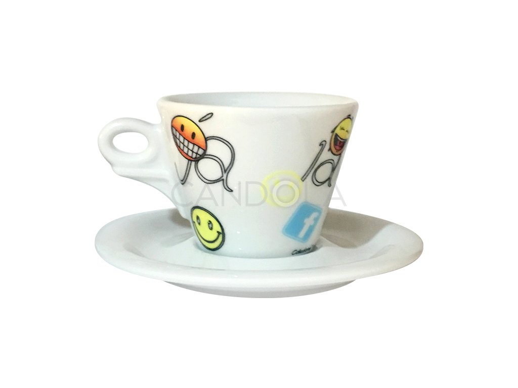 Dekorovaný porcelánový šálek na kapučíno s podšálkem z kolekce silnostěnného porcelánu na kávu Ancap Funny Web. Dno šálku je v optimálním tvaru pro profesionální použití. Dostatečně otevřený ústní okraj poskytuje dostatek prostoru pro latte art. Šálek je na podšálku umístěn mimo střed a tak vzniklý prostor je ideální pro servírování sušenky, cukru či lžičky na kávu. Silnostěnný živcový porcelán skvěle drží teplo a nápoj tak bude mít dlouho správnou teplotu. Na sortimentu z této kolekce jsou moderní zábavnou formou vyobrazeny ikony, internetové chatovací zkratky a emotikony pro všechny nadšené aktivní uživatele sociálních sítí.